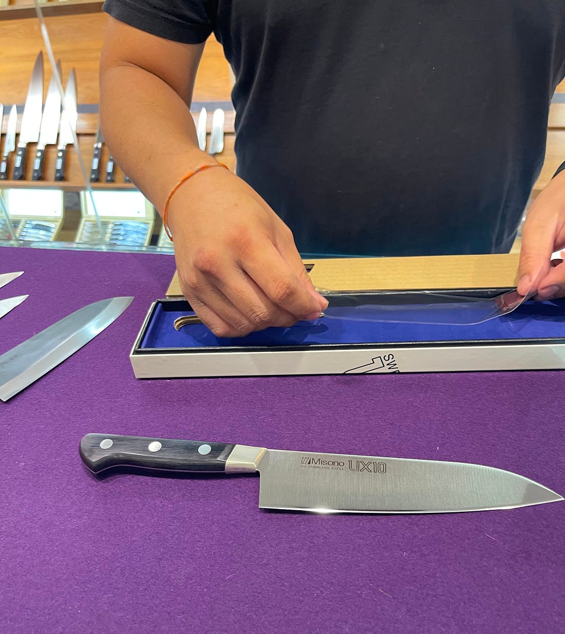 A friend pointed me to an Instagram account called @small.time.citrus, where a local observer castigates newcomers with cutting humor—it’s sometimes painful to read, as most truths are, but always very funny. We don’t want to be assholes. We came here to be part of the community that we fell in love with. We bought a house in town so we could be part of the town. But we are heavily renovating the house, which surely doesn’t help local home prices stay affordable. Thanks to Instagram, or maybe Covid, or perhaps to a growing desire to escape, Ojai has also become something of a “brand,” which makes matters even worse. “Ojai" stood for peace and beauty for more than a century. But there are now towels that have the “eclectic charm” of Ojai, “Pink Moment” ceramics, and even a Pepperidge Farm lemon sugar cookie called Ojai, which—for a town known for its Pixie tangerines—is confounding. I’ve been puzzling over how to be a positive influence in the town, and looking for examples of new people doing good things. The best model may be the Ojai Playhouse. Built in 1914, the theater had been flood-damaged and abandoned for more than a decade when David Berger purchased it in 2020. A movie nut, he renovated it top-to-bottom and built out space for a restaurant next door. Rory’s Place, which was opened by sisters Rory and Maeve McAuliffe, serves local shellfish, herb salad, and hanger steak. David has screened more than 200 films in the theater’s first year. And he often hosts free screenings, as he did on Valentine’s Day with “When Harry Met Sally.” David’s project took years. Becoming a local—just like renovating a business or home—takes time. It can’t be rushed. The name Ojai comes from the Chumash word ʼawha’y, which means “moon.” It feels like the town is shifting phases in the most extreme way, from a full moon to a sliver that develops new light day by day. Once our house is done, and we move in, we will be official residents. Newcomers. I want us to be ones who add to the moon’s glow. Yours in conflicted feelings, Amanda People often don’t invest enough in the products that are most useful to them: coats, olive oil, eyewear, shoes, glassware, and kitchen knives. During winter, you’re going to wear a coat everyday. Olive oil is a foundational flavor of many meals. If you wear glasses, they are your look. Tad would say I invest plenty in all, but with kitchen knives, at least, I can prove him wrong! I’ve always had good knives, but never great knives. For Ojai, I decided it was time to take the leap and get one terrific chef’s knife that I’ll use everyday. I’ll add other good knives over time. For the record, I like having the following mix: chef’s knife, tomato knife, paring knife, and bread knife. A nice-to-have would be a 9-inch carving knife with hollow-edge depressions. My first set of knives were Wusthof, purchased in Germany when I was working at a bread bakery there after college. They were workhorses: sturdy, good heft, maybe a bit stiff. I also have a set of Five Two knives, made with Japanese steel, that Food52 designed in collaboration with its community. (Only the bread knife is still for sale, and it’s a great one!) Food52 also worked closely with Miyabi, a Japanese knifemaker located in Seki, where samurai swords were once made. After visiting the factory with my co-founder Merrill, I was won over by the thinner, sharper Japanese blades. I became smitten with this snazzy knife from Blenheim Forge, and was nearly ready to plunk down a giant sum for it, but thought I should first make a pilgrimage to Korin, the iconic New York City store where nearly every chef I know shops for their knives. They’ve been selling and sharpening Japanese knives since 1982. I was helped by Vincent Lau, who has been Korin’s knife sharpener for 15 years. We talked about wood-handled Japanese knives vs. the heavier Western style handles; on a Japanese knife, the “tang” (or portion of the blade that extends into a knife handle) goes only halfway through, whereas a Western knife’s blade carries entirely through the handle, which makes it weigh more. When people talk about a knife’s balance, they’re usually referring to whether or not they’re comfortable with the handle-to-blade weight ratio. There is no right or wrong, it’s personal preference. Japanese knives tend to be thinner, lighter, and sharper (due to a single bevel edge). But for this sharpness, you give up durability. Thicker Western knives, which have a thicker spine and double bevel edge, are better for tasks like cutting up a chicken carcass and cutting through a squash stem. Japanese knives are better for slicing onions and apples. As Vincent and I talked, I kept pointing to expensive knives with attractive wood handles, but he didn’t seem enthusiastic about them for me. So I asked him what knife he’d recommend given our conversation. He pulled out a 7-inch Misono UX10 Santoku knife that was a sleek yet less artful knife with a Western handle. It was also quite a bit less expensive—$250 vs. the other $300-and-above knives. I immediately liked how it felt in my grip. I showed him the Blenheim Forge knife, with its faceted handle and brass bolster, on my phone. He said it’s a very good knife, but the steel is very hard and it would be a real time investment to sharpen. Aesthetics nearly got the best of me (not for the first or last time!), but the more I learned about the Misono, the more I came around to its humble demeanor. Unlike many smaller knife makers, who outsource parts of the process, Misono makes each knife beginning to finish, so they have full control over every step. Most knives’ bolsters are welded to bond the bolster around the heel of the blade, which adds unwanted heat to this part of the blade. The nickel bolster on the Misono is riveted on, so there’s no added heat. The blade itself is steel with enough carbon in it to create