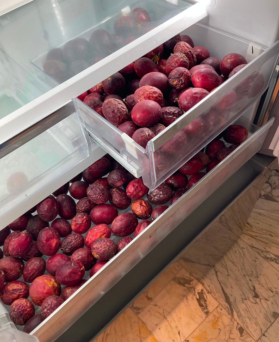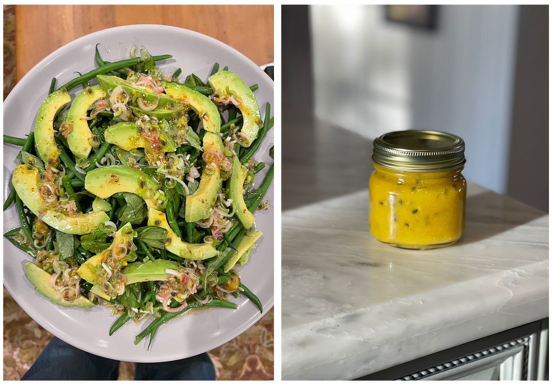 The problem was that the countertop stone was already partially finished, and the fabricator didn’t have the equipment to create the feature I wanted. That wasn’t going to stop this perfectionist, no, no, no. Rather than live with what I’d consider an unrealized and thus imperfect countertop, I insisted we find another fabricator to do the job. This involved, as you can imagine, a big budget jump as this new fabricator was more expensive and we now also had to pay for the additional transport of the stone slab from one fabricator to another. This also caused a delay in the project as, naturally, the countertop needed to be in place before installing the faucet, the backsplash, the wood-paneled wall, and the sconces…and these needed to be in place before installing the cooking range. Harumpf! The second fabricator did a beautiful job and got the countertop delivered on the timeline we’d set. The day of install, I got a call from Reath. The new feature looked stunning but there had been a miscommunication and the cut-out for the sink had been cut so that the countertop ended in line with the sides of the sink, rather than hanging over by half an inch (as all the other countertops with sinks in the house do). Nothing could be done, unless I wanted to make a fuss and get the whole thing replaced. It actually looked very nice, as is, but I had to laugh. Perfectionists are often humbled by the vagaries of life. Now, whenever I use this sink, which will be approximately 87 times per day, I will be reminded of my limitations, yes, and of my dreams. I find this funny and weighted at once. The Japanese say, “Fall seven times, stand up eight.” I’m a proud perfectionist, you see. We set high expectations for ourselves and others. We do the work. Often, great things happen. It’s my edge and I hope to never lose it! That said, I am belatedly realizing that anyone who’s reading this is unlikely to invite me over to their house. Signing off with this video of me taming my perfectionist tendencies as our timeline stretched out (and out) over the course of the build. I guess I was partly to blame. Yours in aiming high, failing, and aiming high again, Amanda What your palate needs the day after Thanksgiving is some raucous acidity to shake it from its slumber. I am here to deliver on this need. During a recent trip to Ojai, Tad and I stayed in our neighbor’s guest house and when we arrived, the fridge contained just one thing: ripe passion fruit. Two hundred of them! Harvested from the crop on their property, this was just the overflow from the main house. I hadn’t cooked much with passion fruit, so I dove in! This bright and floral dressing was my first success (see the recipe in the video below). I also made passion fruit jam and this silky passion fruit curd (above), which I spread on toast and ate for breakfast mixed with coconut yogurt. |