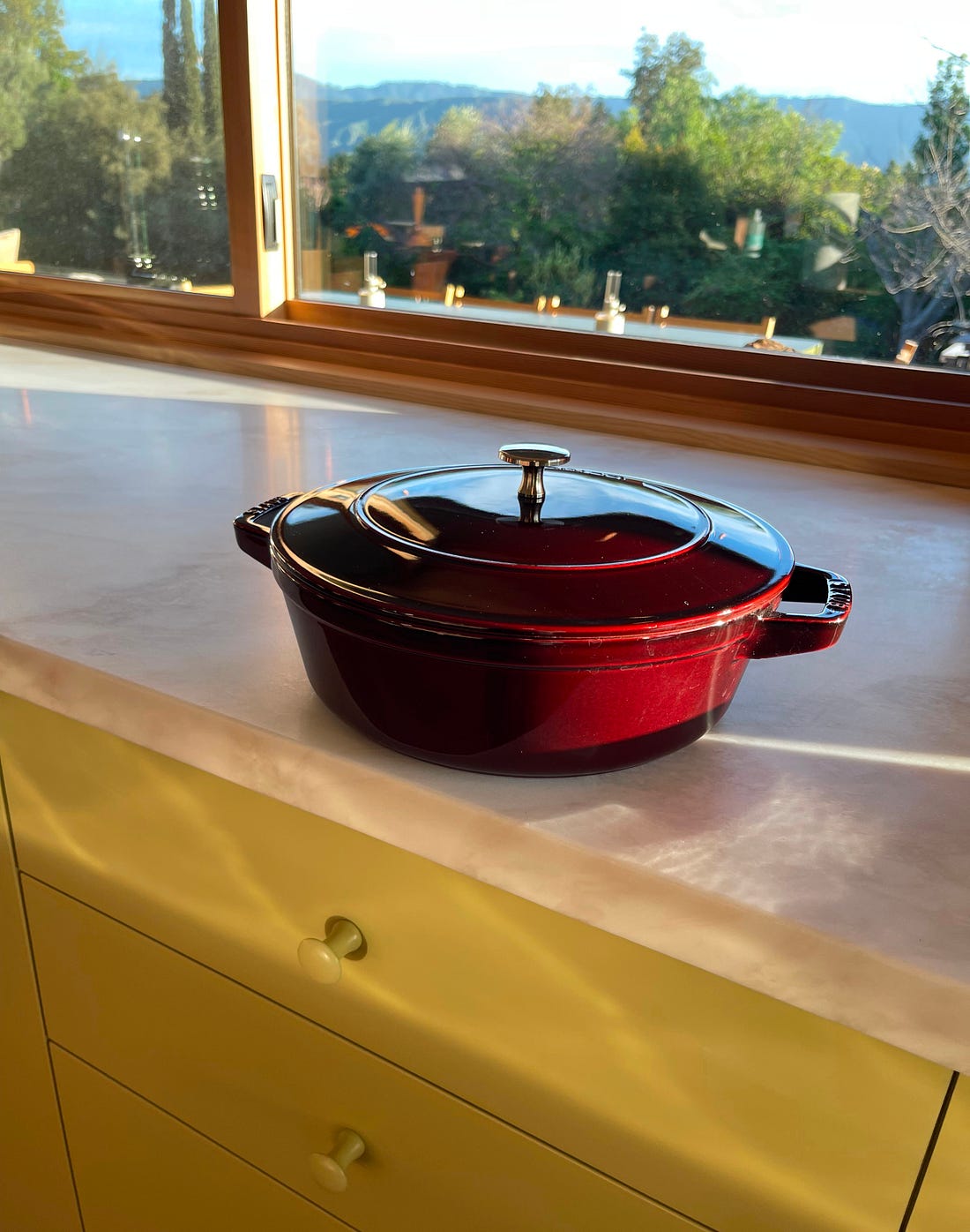 We made it to February! Today is all about plates. And cake. A spectacular one from Dorie Greenspan. But first… A bit of housekeeping: If you signed up for a Founding Member subscription after November 25, 2025 and have not received an email from me about sending you a signed copy of my book, The Essential New York Times Cookbook, please DM me so I can get you a copy! (And for anyone who doesn’t have a Founding Member subscription, you can upgrade here if you’d like to get a book, too.) And a “D’oh!”: Last week, I spent the afternoon with my new neighbor, the designer Nathan Turner. We made tangerine and orange marmalade on the Vulcan gas stove he has in his outdoor kitchen (a smart move in a warm climate)—video here. One of my jobs was to retrieve the processed jam jars from the simmering water, and I used jam-jar tongs to do so. A kind viewer wrote in to let me know I was doing it wrong: I had the tongs upside down. As they explained, “Flipping them over will make your life easier! The grippy, rounded, silicone portion is made to grab the jar top. The rolly, hard plastic helps your fingers slide with the handle.” Erp—next time. As I wrote in my last post, I’m discovering that moving in and filling this house with personal touches and all the small goods that I love is going to take time. Turns out, there really is no dramatic before/after, even for the people moving in. While those “quick” transformations are fun to look at, I’m more interested in the human dynamics, design details, and craft that go into making a beautiful home—and making it your own. I’ve been insistent that we don’t rush into acquiring all of the utilitarian objects in our house, but I quickly learned there are some items I’d need to prioritize: scissors, wastebaskets, and everyday dinner plates, to name a few. When we moved into our house, all we had was a stack of vintage cabbageware plates that I’d shipped out from Brooklyn. The best vintage cabbage plates have a finely webbed surface covered with crevices and ridges. These details make for a beautiful plate and, as we learned after using them for a few weeks, make them a nightmare to navigate with a fork and knife! Your fork feels like this. We were looking for something low-key and hand crafted, maybe a little earthy but not rustic. I wanted a solid hue that I could then mix with patterned salad plates and bowls. I’d ordered samples of Heath’s Chez Panisse main plate in sorrel; the Commune for Heath dinner plate in barley; Sarah Kersten’s Coupe main plate in both garnet and klamath wheat; and Kati von Lehman’s Place Setting No. 1 in the charcoal glaze.